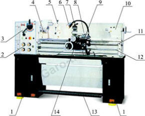 На левом конце станины крепится шпиндельная бабка 3 и коробка подач 2. В шпиндельной бабке находится коробка скоростей станка, основной частью которой является шпиндель. На шпинделе установлен зажимной патрон 4. Коробка подач 2 служит для передачи движения от коробки скоростей на ходовой вал 12 или ходовой винт 11. В корпусе шпиндельной установлен электрический блок управления.