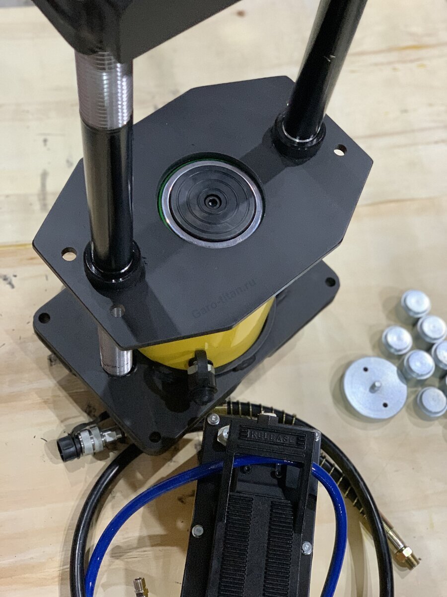 Компания ООО "ГАРО-ТИТАН" предлагает пневмогидравлический выпрессовщик шкворней модели ТТН-103П предназначенный для выпрессовки, запрессовки шкворней диаметром от 40 до 65 мм, поворотных цапф грузовых автомобилей без демонтажа передней балки на станциях технического обслуживания и автотранспортных предприятий. Выпрессовщик ТТН-103П является надежным и точным съемником, который особенно востребован для быстрого и безопасного обслуживания ходовой части грузовых автомобилей. Так, как шкворень запрессован достаточно плотно, его демонтаж при помощи молотка, кувалды может привести к повреждению поворотного кулака. Для аккуратного извлечения и установки новой детали применяют специальные съемник – выпрессовщик..